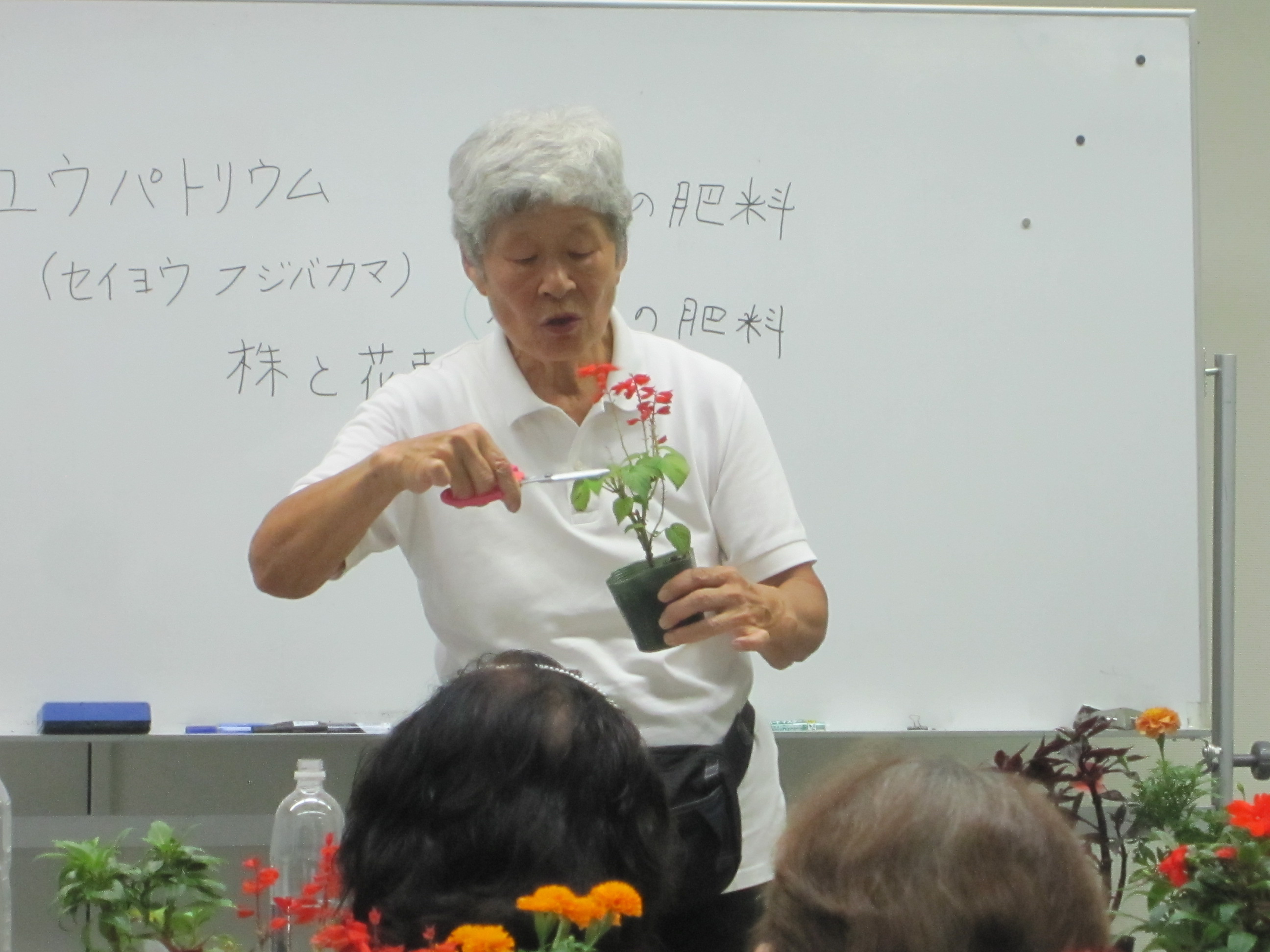 今回は「土の話」と「夏・秋花壇の切り戻し」という2つのテーマを実施しました。講師の白瀧先生(上総更級公園 園芸アドバイザー)から講習として土の話の説明を受けた後、夏・秋花壇の切り戻しを参加者の方々に実習としてニューギニアインパチェンス・サルビア・マリーゴールドの切り戻し体験をしていただきました。
